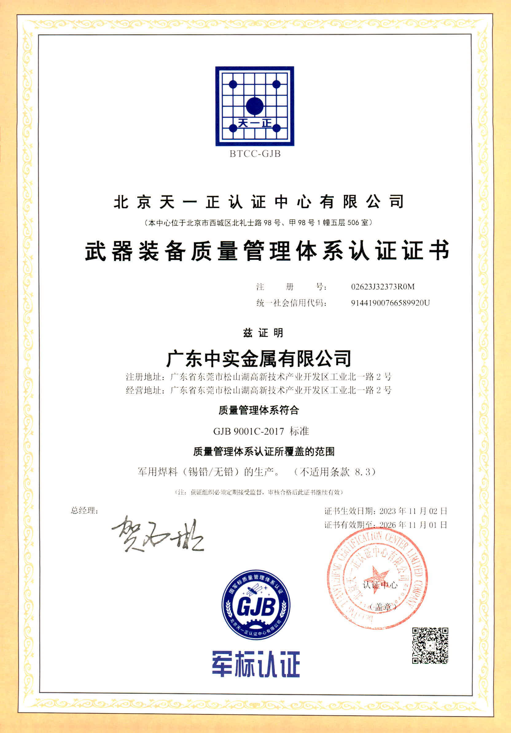 中实金属顺利通过武器装备质量管理体系认证评审,标志着中实金属在军工领域能力的一次突破,蓝颜gtv质量将得到更有力的保证,提升了公司形象,同时为公司进一步向军品研发及销售的扩展打下了坚实的基础。