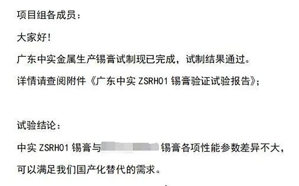 Recently, received the news, after more than half a year of comparative test demonstration, Zhongshi solder paste excellent performance, from a number of domestic manufacturers to be selected to stand out, successfully passed the verification process, can be used to replace the international brand solder paste used by customers, to meet the needs of customers localization replacement.